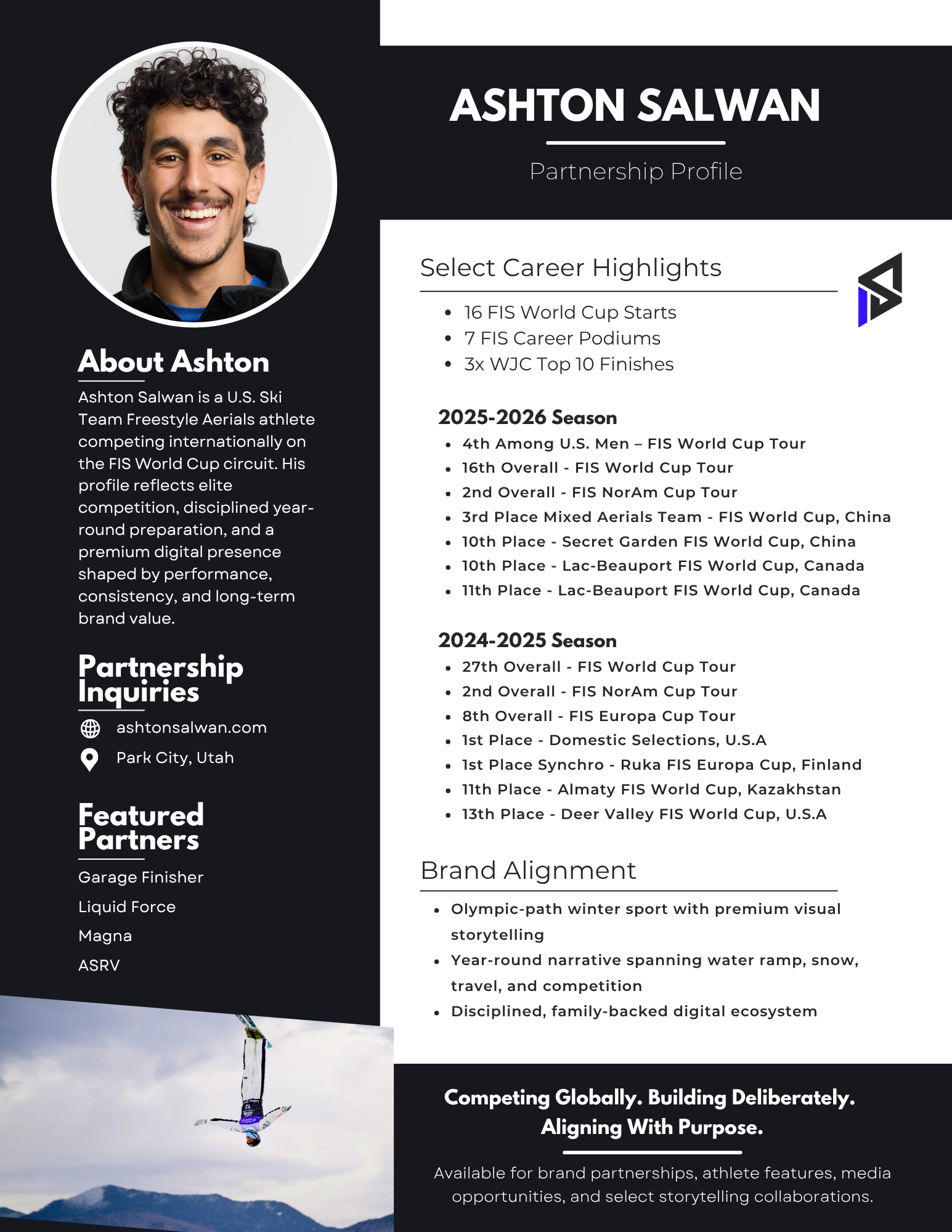 Brands, collaborators, and media can view/download Ashton Salwan’s partnership one-sheet below for a concise overview of his athletic profile, competition experience, current platform, and synergy fit.